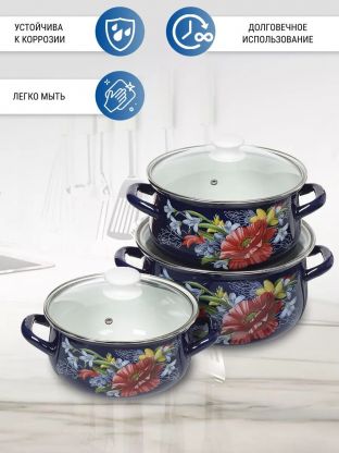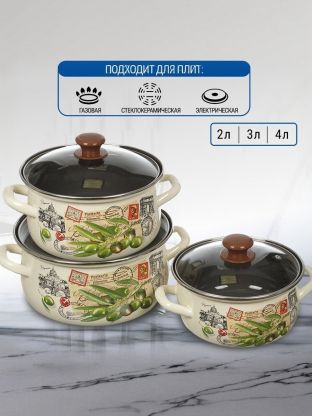 Набор посуды эмалированная сталь, 6 предметов, кастрюли 2,3,4 л, индукция, Сибирские товары, Рябинка 15, N15L05, в ассортименте