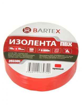 Изолента ПВХ, 19 мм, 150 мкм, красная, 20 м, индивидуальная упаковка, Bartex