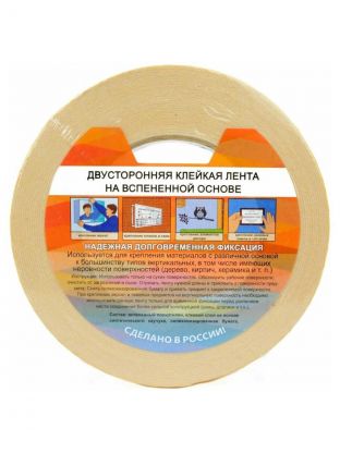 Двухсторонняя лента монтажная на основе вспененного полиэтилена с нанесенным с обеих сторон клеем на основе акриловой дисперсии. Применяется как альтернативный способ крепления на вертикальные поверхности не только легких изделий из бумаги и пластика, но и более тяжелых - из дерева, стекла и металла.