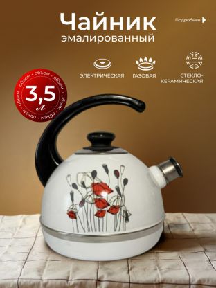 Чайник эмалированный стальной 3.5 л со свистком «Полевые маки» — вместительный и долговечный вариант для кухни или дачи. Красивый дизайн, термоизолированная ручка, цена без переплат.