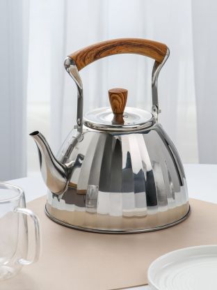 Чайник рассчитан на 3 литра, выполнен из нержавеющей стали, имеет компактную форму для удобного хранения и легкий вес, что облегчает использование даже при полном объеме.
