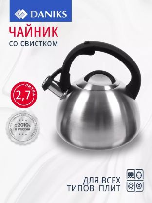 Чайник Daniks 2.7 л из нержавеющей стали со свистком — для дома и дачи, совместим с индукцией, безопасная нейлоновая ручка, выгодная цена.