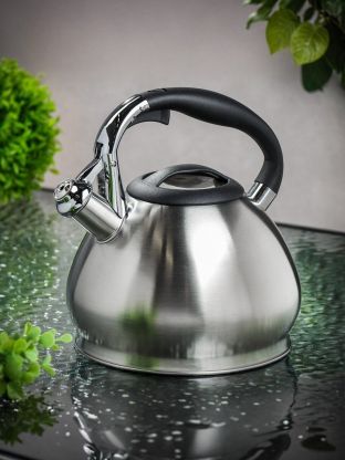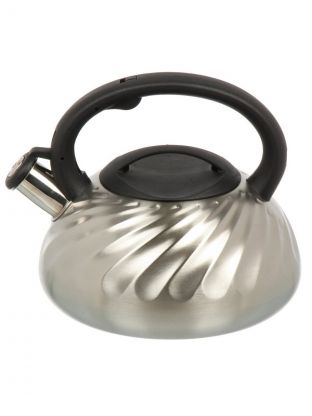 Объём чайника — 2,7 литра, корпус выполнен из матовой нержавеющей стали, ручка — из термостойкого нейлона, что обеспечивает долговечность и безопасность.