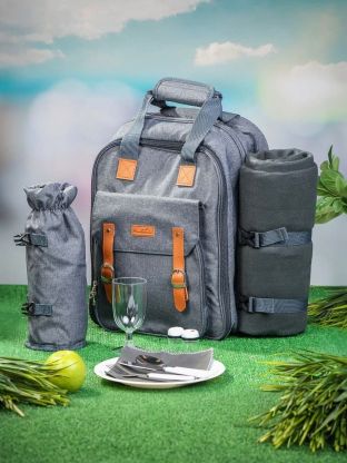 Сумка, плед, 4 пластиковых бокала, 4 тарелки, 4 вилки, 4 ложки, 4 ножа, разделочная доска, набор для специй (соль, перец). Охлаждающий аккумулятор не входит в комплект.