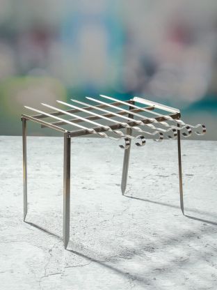 В комплекте 6 плоских шампуров из нержавеющей стали и стойка размером 360х180х270 мм для удобства приготовления и подачи.