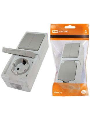 Блок комбинированный открытой установки, 1 гнездо, двухклавишный, с заземлением, 10 А, с защитными шторками, IP54, TDM Electric, Вуокса БКВР, SQ1803-0010