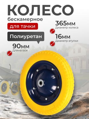 Диаметр колеса 365 мм и втулка диаметром 20 мм обеспечивают совместимость с большинством моделей садовых и строительных тачек. Подшипник в конструкции гарантирует плавный и легкий ход, уменьшая нагрузку при перевозке тяжелых грузов. Прочная ось длиной 90 мм обеспечивает дополнительную устойчивость и надежность при интенсивной эксплуатации.