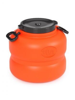 Объём — 50 л, диаметр горловины — 150 мм, высота — 54,5 см, диаметр — 38 см. Материал — пищевой пластик, цвет — оранжево-серый, с крышкой и ручками.