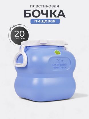 Объём — 20 литров. Бочка изготовлена из пищевого пластика, подходит для хранения воды, солений, ягод, круп и других продуктов.