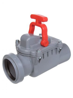 Клапан обратный канализационный с запирающей заслонкой из профилированной нержавеющей стали с язычковым уплотнением, с ревизионной крышкой и присоединительными выходами под раструбные трубы ПП, ПВХ, с возможностью фиксации заслонки в закрытом состоянии при помощи ручного фиксатора с предохранителем от самопроизвольного закрытия.