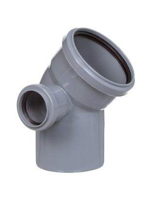 Уголок с отводом канализационный Ростурпласт диаметром 110 мм под углом 45 градусов для монтажа систем внутренней канализации. Имеет выход справа для трубы диаметром 50 мм.