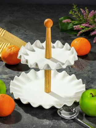 Двухъярусная фруктовница выполнена из керамики в виде двух блюд на деревянной ножке. Фруктовница станет идеальным украшением любой кухни или прекрасным подарком для вас и ваших близких.