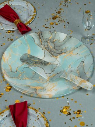 Блюдо стекло, 2 предмета, 30 см, круглое, с лопаткой, бирюза, Daniks, Флюид