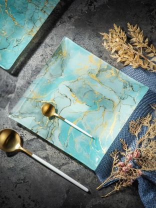 Daniks Флюид — квадратная, с абстрактным рисунком «под мрамор», что делает ее стильной альтернативой классическим круглым тарелкам и выгодным выбором для сервировки.