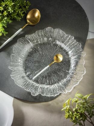 Диаметр 27 см, материал — прочное прозрачное стекло с рельефным декором «Лед», высота бортиков оптимальна для большинства закусок и салатов.