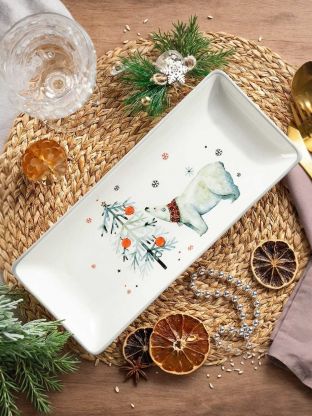 Блюдо из доломита «В ожидании чуда» — это не просто посуда, а элемент праздничного декора с современным новогодним рисунком. Прямоугольная форма 28х12 см идеально подходит для подачи салатов, закусок, фруктов и даже десертов на праздничный стол. Благодаря бортикам блюда удобно использовать для жидких и порционных угощений, а белый цвет с тематическим рисунком гармонирует с любой сервировкой.