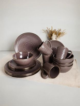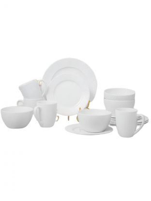 В наборе 16 предметов из прочной керамики: 4 обеденные тарелки (диаметр 25 см), 4 суповые тарелки (диаметр 20 см), 4 десертные тарелки (диаметр 19 см), 4 чашки с блюдцами. Керамика устойчива к сколам, не впитывает запахи, подходит для посудомоечной машины.