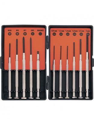 В наборе 11 отверток (№00; №0; №1; AWL; MAGNES; 0.9 мм; 1.2 мм; 1.4 мм; 1.8 мм; 2.4 мм; 3 мм). Стальные рукоятки со специальным рифлением не выскальзывают из рук.