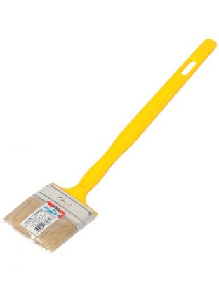 Плоская кисть Акор - ручной малярный инструмент с удлиненной пластиковой ручкой и со светлой натуральной щетиной. Используют для нанесения лакокрасочных материалов на поверхности радиаторов.