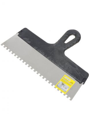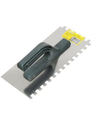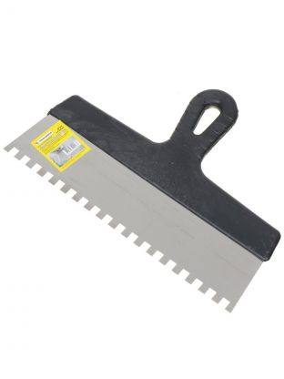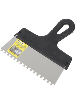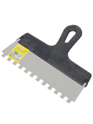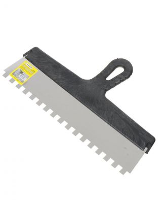 Предназначен для нанесения и выравнивания клеевых составов при укладке кафельной плитки, керамогранита, облицовочного камня. Рукоятка изготовлена из пластика черного цвета, полотно из пружинной стали с антикоррозийным покрытием.