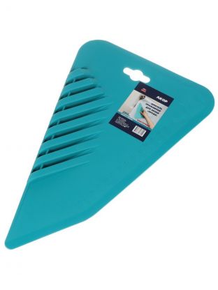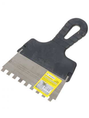 Предназначен для нанесения и выравнивания клеевых составов при укладке кафельной плитки, керамогранита, облицовочного камня. Рукоятка изготовлена из пластика черного цвета, полотно из пружинной стали с антикоррозийным покрытием.