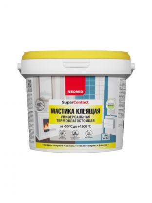 Мастика клеящая универсальная термовлагостойкая (высохший клеевой шов выдерживает температуру от -50°С до +1300°С) «NEOMID» предназначена для кладки и облицовки печей и каминов, склеивания кафельной и метлахской плитки, стекла, пенополистирольных потолочных плиток, дерева, картона, бетона, кирпича, натурального и искусственного камня (кроме материалов на гипсовой основе) в любых сочетаниях, неглубокой шпатлевки оштукатуренных и бетонных поверхностей, наклеивания фанеры на стяжку (кроме поверхностей, имеющих постоянный контакт с водой). При склеивании материалов имеющих периодический контакт с водой, для швов использовать влагоустойчивые герметики или затирки. Содержит антисептические добавки. Препятствует образованию плесени и грибов.