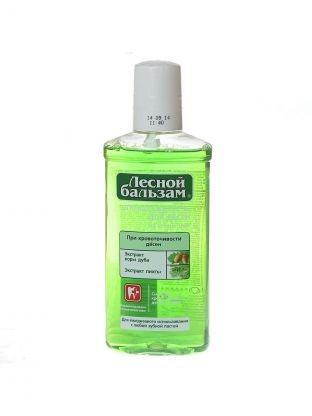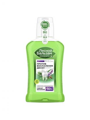 Бренд Лесной бальзам - это проверенные продукты, способствующие снижению воспаления, кровоточивости десен и обеспечивающие качественную профилактику основных проблем полости рта в домашних условиях. Формула ополаскивателя для полости рта при кровоточивости десен на 95% состоит из компонентов натурального происхождения, имеет насыщенный вкус хвойных масел в сочетании с мятной свежестью. Содержит хвойный комплекс (на основе экстрактов пихты, живицы, можжевельника) с отваром 5 целебных трав, экстрактом коры дуба и соком алоэ. Такой сбалансированный состав способствует укреплению кровеносных сосудов десен, улучшает кровообращение и питание мягких тканей полости рта, препятствует повторному возникновению кровоточивости при чистке зубов. Характеристики: Вид аромата: хвойный; Текстура продукта: однородная жидкость без посторонних примесей; Форма продукта средства (концентрата): жидкость; Цвет продукта: зеленый; Профилактический ополаскиватель для полости рта Лесной бальзам на отваре трав обладает иммуноактивным действием, помогает решить проблему кровоточивости десен и в 2 раза улучшает работу собственного иммунитета полости рта, снижая риск развития проблем с деснами. Клинически-доказанный эффект: С первого применения улучшает состояние десен; До 94% снижает кровоточивость десен при регулярном использовании; В 5 раз снижает скорость образования налета на зубах, уменьшая бактериальную нагрузку на мягкие ткани полости рта, не нарушает баланс микрофлоры;