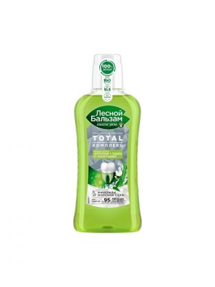 Лесной бальзам Total комплекс с морской солью, экстрактом имбиря и чаем матча, в составе которого 98% ингредиентов натурального происхождения. Ополаскиватель борется с первопричиной развития серьезных проблем полости рта – зубным налетом, который вызывает кариес, влияет на изменение цвета зубов, приводит к образованию зубного камня и кровоточивости десен.
