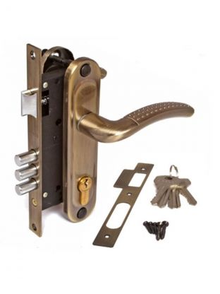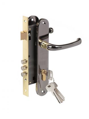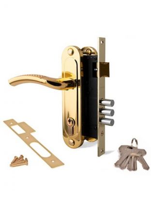 Серия врезных замков с широким ассортиментом форм и цветов ручек на планке. Также в этой серии представлены замки без ручек в комплекте. Все замки укомплектованы надёжными цилиндровыми механизмами секретности длиной с ключами английского типа или профильными. Сертифицированы на 2 класс по российскому ГОСТ, по безотказности работы засова и защёлки соответствуют 4 классу. Назначение: Общее. Тип крепления: Лицевая планка. Тип ригелей: Цилиндрические. Количество ригелей: 3. Вылет ригелей: 20 мм. Диаметр ригеля: 12 мм. Удаление ключевого отверстия (Backset): 45 мм. Тип механизма секретности: Цилиндровый. Тип цилиндрового механизма: Евроцилиндр. Тип ключа: Английский. Количество ключей: 5 шт. Механизм постоянного ключа: Нет. Комплектация цилиндром: Комплектуется. Типоразмер цилиндра: 30/30 мм. Материал цилиндра: Латунь. Покрытие цилиндра: Гальваника. Цвет цилиндра: Золото. Дополнительный механизм секретности: Нет. Защелка: Классическая. Тип защелки: Универсальная. Межосевое расстояние: 85 мм. Рекомендуемая толщина двери: 35 - 40 мм. Комплектация ручками: Комплектуется. Способ установки ручки: Стяжки. Материал ручки: ЦАМ. Покрытие ручек: Гальваника. Цвет ручки: Черный. Автоматическое запирание: Не автоматическое. Количество точек запирания: 1. Дополнительное запирание изнутри: Нет. Покрытие лицевой планки: Гальваника. Цвет лицевой планки: Золото.
