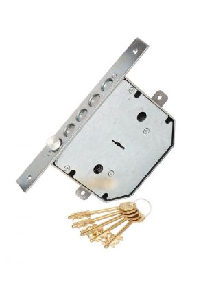 Врезной замок предназначен для на установки на входную дверь. Поставляется с личинкой под сувальдный ключ. Имеет целый ряд защитных конструктивных преимуществ от криминального вскрытия: 5 ригелей с вылетом 40 мм., оцинкованный корпус с надежной защитой от коррозии. Высокая степень защиты от силового взлома. Количество штырей 5 шт. Вылет ригелей 40 мм Диаметр ригелей 17.7 мм Длина ключа 102 мм Количество ключей 5 шт. Материал ключа латунный с пластиковой головой Бэксет 65.5 мм. Длина планки: 244 мм.
