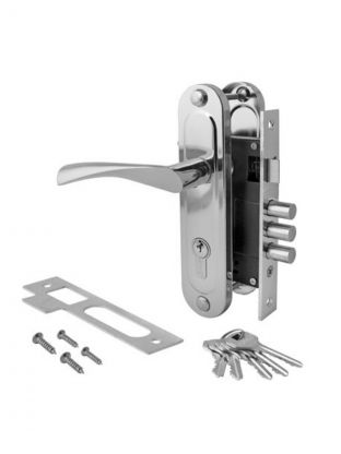 Универсальный врезной замок под ручку и евроцилиндр для деревянных межкомнатных и входных дверей с межосевым расстоянием 61,5 мм. Характеристики: Тип крепления: лицевая планка; Тип ригелей: цилиндрический; Количество ригелей: 3; Вылет ригелей: 18 мм; Диаметр ригеля: 12 мм; Удаление ключевого отверстия (Backset): 40 мм; Тип механизма секретности: цилиндровый; Тип ключа: английский; Количество ключей: 5 шт.; Типоразмер цилиндра: 30/30 мм; Материал цилиндра: ЦАМ; Материал сердечника: ЦАМ; Цвет цилиндра: хром; Защелка: классическая; Тип защелки: универсальная; Межосевое расстояние: 61.5 мм; Комплектация ручками: да Способ установки ручки: стяжки; Материал ручки: алюминий; Покрытие ручек: гальваника; Цвет ручки: хром; Наличие ответной планки в комплекте: да; Рекомендуемая толщина дверного полотна: 35-40 мм; Размер сечения квадрата ручки: 8 мм; Тип цилиндрового механизма: евроцилиндр; Размеры (ширина/высота/глубина): 200/80/100 мм.