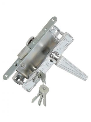 Замок врезной с ручками предназначен для установки в деревянные двери толщиной до 45 мм, правого и левого открывания. Ручки оснащены пружинами. Характеристики: Три стальных ригеля круглого сечения диаметром 12 мм, вылет 20 мм; Стальной корпус, покрыт гальваническим покрытием; Межосевое расстояние 85 мм; Удаление ключевого отверстия 45 мм; Материал: алюминиевый сплав;