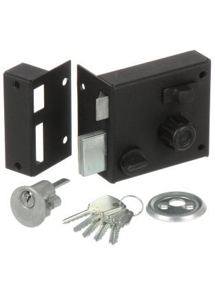 Замок накладной цилиндровый с вертушкой. Предназначен для установки на деревянные двери. Засов из трех цилиндрических ригелей диаметром 14 мм, с максимальным вылетом 30 мм. Удаление ключевого отверстия - 60 мм. Габариты замка - 130х80х24 мм. Комплектация - 5 ключей, запорная планка, накладка. Механизм замка под перфо-ключ, идет совместно с корпусом. Закрывание и открывание замка изнутри производится вертушкой, снаружи ключом.
