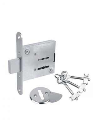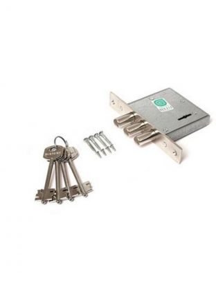 Врезной замок с сувальдным механизмом секрета. Оснащен двумя стальными ригелями диаметром 10 мм. Предназначен для установки в деревянные и металлические двери толщиной до 50 мм. Материал: сталь Количество ключей: 3шт