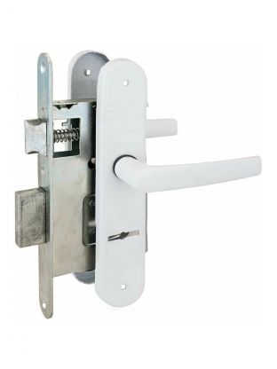 Замок врезной с ручками предназначен для установки в деревянные двери толщиной до 45 мм правого и левого открывания. Характеристики: Ригель прямоугольного сечения, вылет 22 мм. Универсальная защелка. Стальной корпус, покрыт гальваническим покрытием. Межосевое расстояние: 55 мм. Удаление ключевого отверстия: 55 мм. Материал ручек: алюминиевый сплав. Цвет: белый. Комплектация: замок, цилиндровый механизм 70 мм, 4 ключа, ручки, ответная планка, винтовые стяжки.