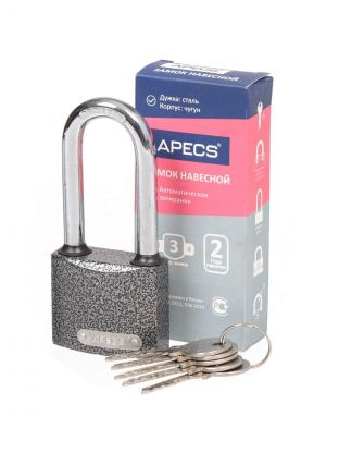 Навесные замки – это механические запорные устройства, открывающиеся только снаружи. Современный навесной замок – это высокотехнологичное устройство, способное обеспечить сохранность вашего имущества. Навесной замок способен обеспечить неприступность вашего гаража или дачного домика не хуже, а в некоторых случаях даже лучше, чем врезной замок. Сегодня навесные замки изготавливаются с учетом неблагоприятных погодных условий. Замки оборудованы специальными отверстиями для отвода влаги, шторками для цилиндра. Для того чтобы замки были «всепогодными», они обеспечены эффективной защитой от коррозии. Современные технологии позволили надежно защитить навесные замки от грубого механического воздействия. Навесные замки Apecs, представлены в широком ассортименте качественных и надежных замков, предназначенных для самых разных конструкций. Современные навесные замки – это надежные устройства, соответствующие самым строгим требованиям. Тип механизма секретности: Цилиндровый. Тип цилиндрового механизма: Под английский ключ. Автоматическое запирание: Автомат. Материал: Чугун. Размеры замка: 50х81 мм. Диаметр дужки: 9 мм. Применение Замок предназначен для запирания дверей, снабженных дверными проушинами. Замок автоматический, т.е. закрывается без использования ключа. В комплект входят 3 стальных ключа с металлической головкой. При использовании замка в зимнее время при запирании наружных дверей рекомендуется, по мере необходимости, смазывать его графитовой или аналогичными смазками. Не использовать для чистки абразивные материалы и растворители.