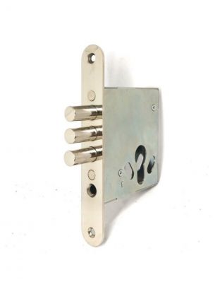 Врезной замок Apecs редназначены для установки как в деревянные двери, так и в металлические. Превосходное качество покрытия, точность изготовления деталей, точность сборки, и современная конструкция замка дают высочайшие показатели работоспособности, превышающие самые высокие требования. Характеристики: Межосевое расстояние: 85 мм; Количество ригелей: 3 шт.; Длина: 71 мм; Ширина: 23 мм; Высота: 238 мм; Удаление ключевого отверстия (Backset): 45 мм; Вылет ригеля: 20 мм; Диаметр ригеля: 12 мм. Преимущества: Замок предназначен под ручку и евроцилиндр для деревянных и легких металлических входных дверей; В замке присутствует подшипник в узле ручки, обеспечивающий плавность хода и долгий ресурс службы. Дополнительная информация: Ответной планки нет в комплекте.