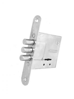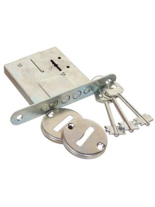 Врезной замок с сувальдным механизмом секрета. Оснащен двумя стальными ригелями диаметром 10 мм. Предназначен для установки в деревянные и металлические двери толщиной до 50 мм. Материал: сталь Количество ключей: 3шт
