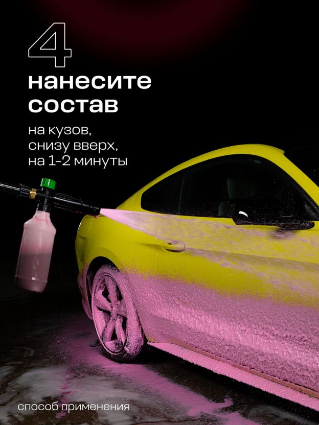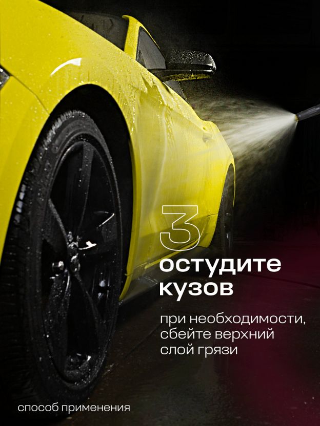 Остудить кузов автомобиля , при необходимости сбить верхний слой грязи, после чего нанести разбавленный состав снизу вверх, чтобы избежать подтеков.
