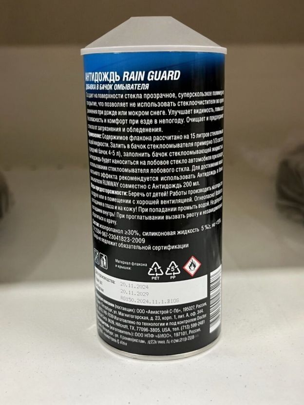 Антидождь для автомобиля – это расходный материал для обеспечения оптимального обзора через лобовое стекло. При сильных осадках, в частности дождей, снегопада, града и прочих неблагоприятных природных условиях, улучшить обзор и повысить безопасность езды Вам поможет антидождь RUNWAY. Средства класса антидождь образуют на стекле гладкую тонкую пленку, обладающую водоотталкивающими свойствами. Вода скатывается со стекла быстрее, не оставляя капель. Грязь также на окне не задерживается, оно не обледеневает. Благодаря обработке стекла антидождем дворники не царапают его частичками грязи, нагрузка на них существенно снижается. Антидождь делает работу дворников более простой, снижая износ резинок. После нанесения на поверхность, все лишние вещества улетучиваются, остаются только полимеры. Они в свою очередь соединяются в водоотталкивающую пленку, благодаря которой вода стекает по поверхности. Так как погодные условия России суровы, специально для них создано средство Runway. Основной состава стала комбинация силиконов, создающих скользящее покрытие, снижающее трение дворников. Кроме предотвращения появления влаги обладает свойством защищать стекла от наледей и грязевых шапок. Антидождь предназначен для наружной обработки зеркал, фар и стекол автомобилей, мотоциклов, моторных лодок и катеров. Характеристики: Тип: жидкость; Объем: 150 мл; Страна производства: Россия. Преимущества: Снижает трение дворников; Улучшает видимость при дожде и мокром снеге; Повышает безопасность и комфорт при езде в непогоду; Создает на поверхности прозрачное, суперскользкое полимерное покрытие; Очищает и предохраняет стекла от загрязнения и обледенения; Универсален для зеркал, фар и стекол автомобилей, мотоциклов, моторных лодок и катеров. Средство улучшает видимость, повышает безопасность и комфорт при езде в непогоду, также очищает и предохраняет стекла от загрязнения и обледенения.