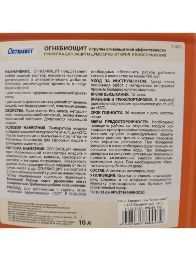 Пропитка «Огнебиощит» С403 предназначается для предохранения древесины от огня и биологического заражения. Служит надежной защитой от гниения, воздействия биоразрушителей, появления синевы. Обработанная древесина становится более трудновоспламеняемой.