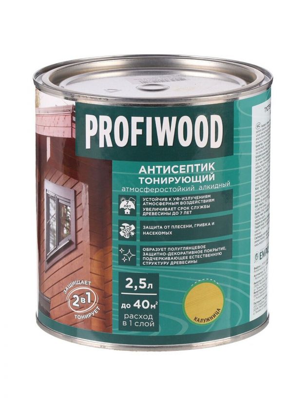 Алкидный деревозащитный антисептический состав Profiwood «2 в 1» обеспечивает долгосрочную защиту древесины от воздействия атмосферных явлений и биологических факторов, а также служит для декоративного оформления.