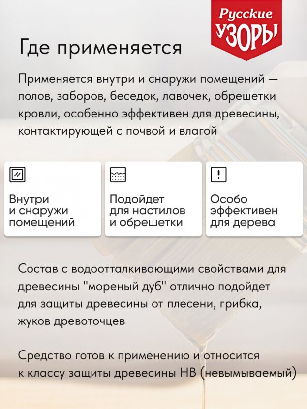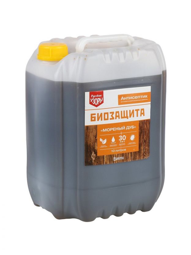 Биозащитный состав с водоотталкивающими свойствами для древесины "мореный дуб" предназначен для защиты древесины от плесени, грибка, жуков древоточцев для наружных и внутренних условий эксплуатации древесины, лаги пола, заборы, беседки, лавочки, настилы по грунту, обрешетка кровли и т.д. Состав готов к применению и относится к классу защиты древесины - НВ (невымываемый) и является средством с низкой коррозионной агрессивностью по отношению к черным металлам.