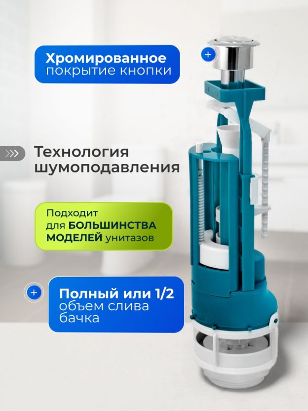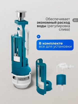Арматура-комплект предназначена для установки в бачок унитаза, для наполнения и подачи воды на смыв в унитаз. Приспособление выполнено из пластика. Арматура с боковой подводкой оснащена кнопкой с двумя режимами для полного слива бачка и частичного для экономии воды.
