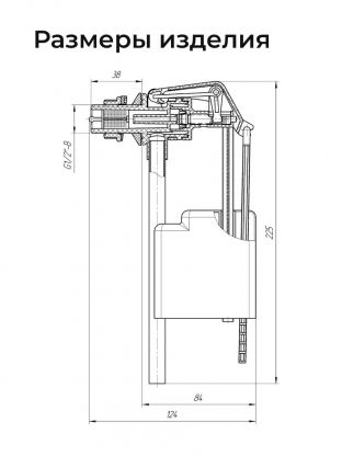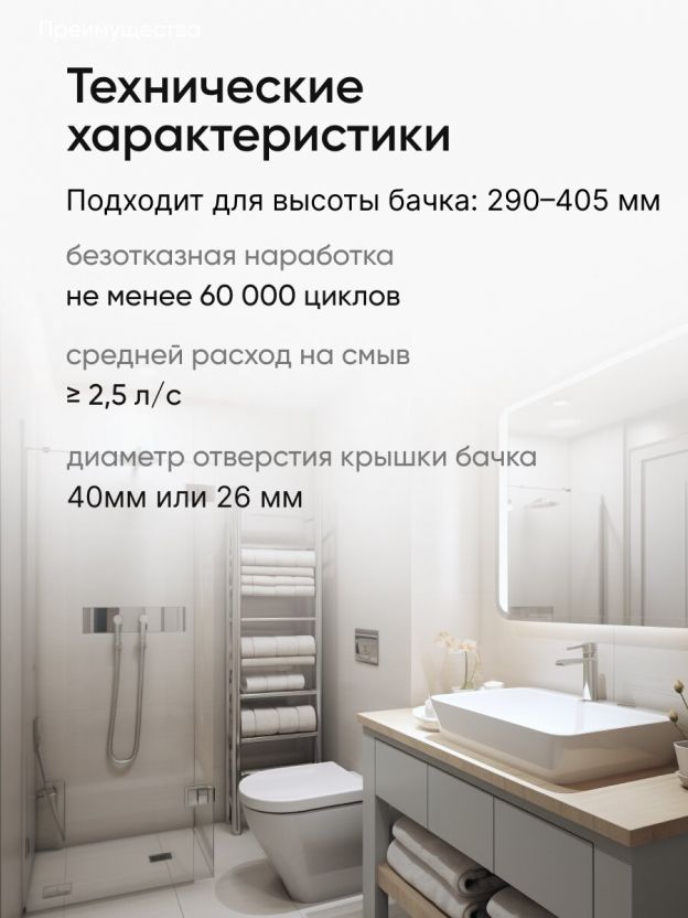 - Усилие и время воздействия на кнопку для спуска воды 20Н и 2с.