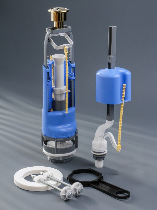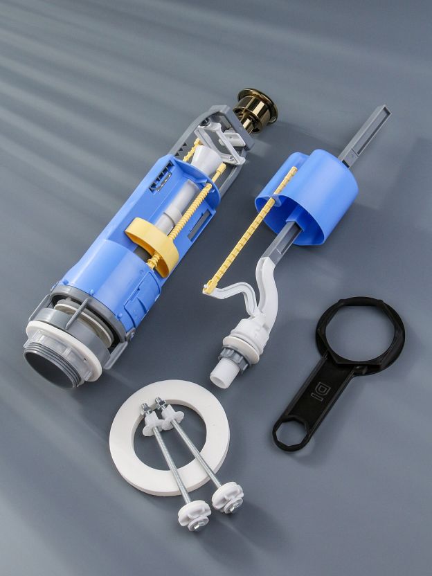 В комплекте прилагается крепление для бачка и ключ для затягивания гаек спускного и наполнительного клапана.