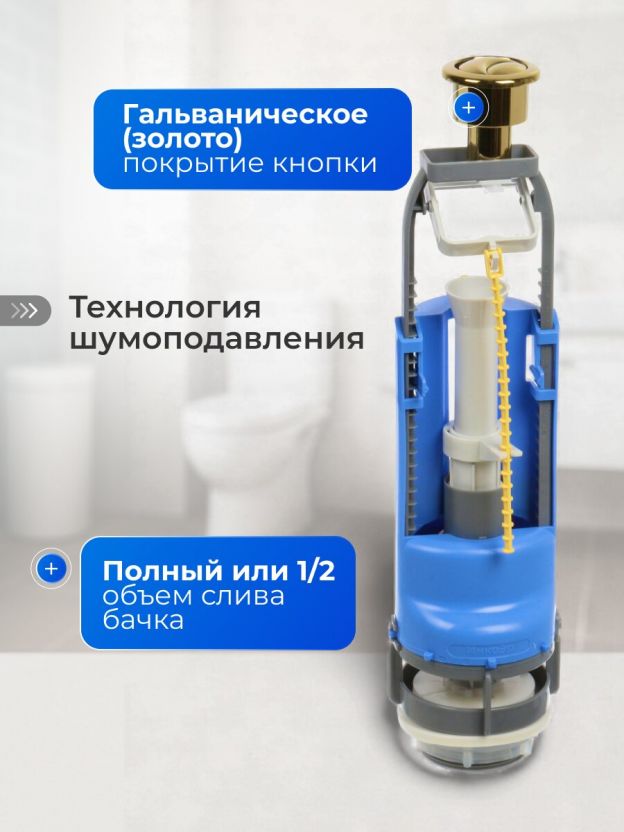 Арматура для бачка унитаза нижняя, 1/2", двухрежимная, кнопочная, гальваника золото, Инкоэр, СБ2м-НпрНРФ-ЗЗ-ККрпс DI Р