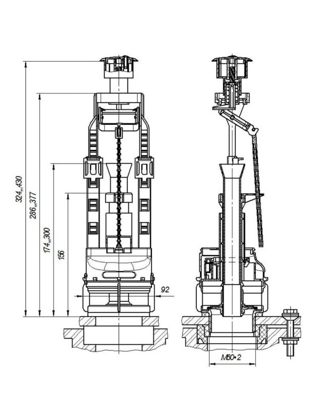 - Сливной клапан предназначен для использования в смывных бачках высотой от 315 до 430 мм и с диаметром отверстия в крышке бачка 40 мм.
