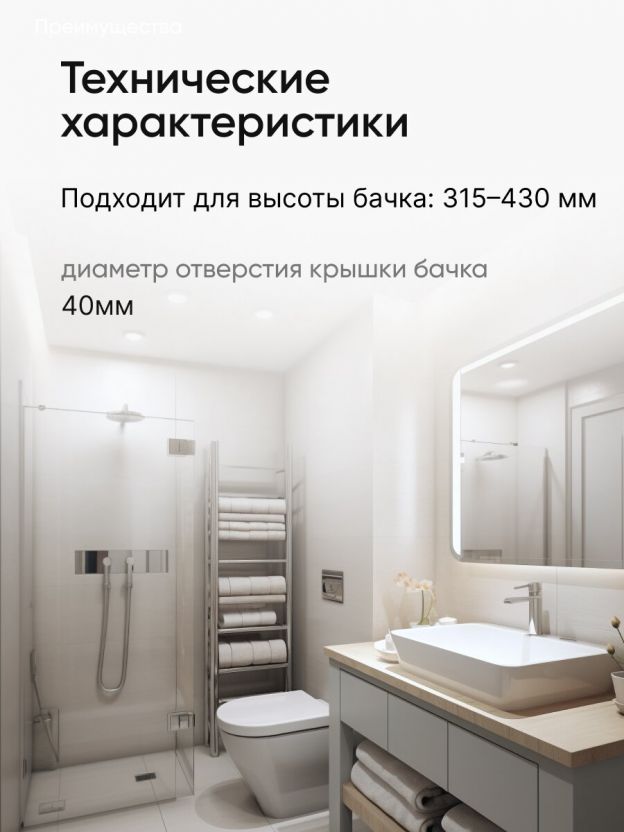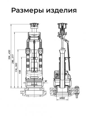 Арматура наполнительная - устройство, автоматически заполняющее определенным количеством воды смывной бачок после его опорожнения и герметически закрывающееся. Предназначена для использования в смывных бачках высотой от 315 до 430 мм, диаметр отверстия в крышке бачка 40 мм.