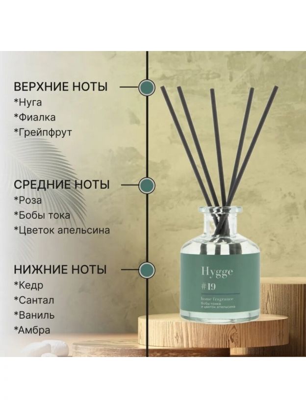 Ароматический диффузор - это безопасный и экологически чистый способ ароматизации помещения. В комплект входят фибровые палочки. Благодаря которым аромат распространяется в помещении. Диффузор рассчитан на помещение до 15 м. Интенсивность аромата регулируется количеством палочек. Не забывайте переворачивать палочки 1-2 раза в день. Характеристики: Объем: 50 мл. Аромат: бобы тонка и цветок апельсина. Материал флакона: стекло. Преимущества: Безопасный. Экологически чистый. Время работы: 1,5 - 2 месяца. Ноты аромата: нуга, фиалка, грейпфрут, роза, бобы тонка, цветок апельсина, кедр, сантал, ваниль, амбра. Диффузоры с фибровыми палочками — это замечательный способ ароматизации вашего дома. Они абсолютно безопасны, экологически чисты и натуральны, что делает их отличной альтернативой химическим ароматизированным спреям. Эти диффузоры наполняют ваш дом приятными и стойкими ароматами, создавая ощущение свежести и уюта. С каждым движением воздуха, фибровые палочки медленно рассеивают аромат по всему помещению, наполняя ваш дом гармонией и комфортом.